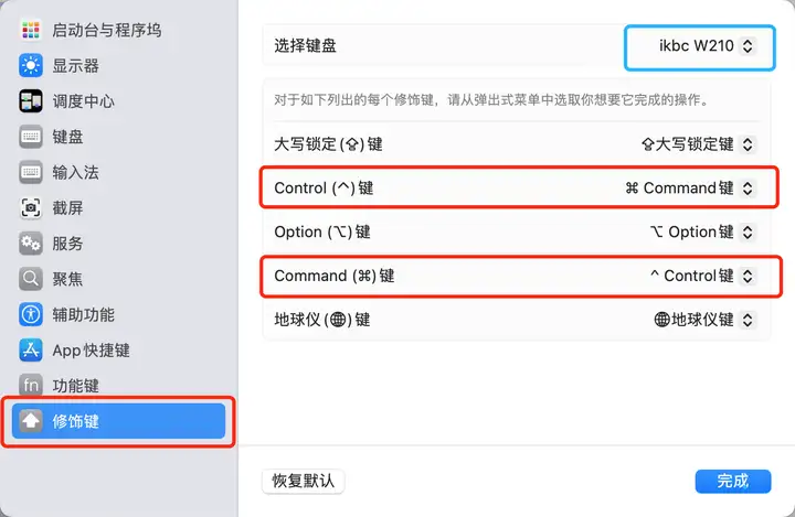 4. 交换 Control 与 Command 键功能在修饰键设置界面中,找到 Control 键 和 Command 键 的下拉选项:
