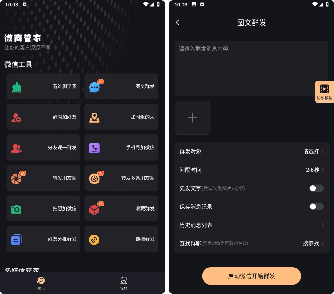 • 全格式一键群发:兼容文字、图片、视频、收藏内容、链接、公众号、小程序、名片等多种格式,一键群发至好友或微信群,推广信息触达更高效