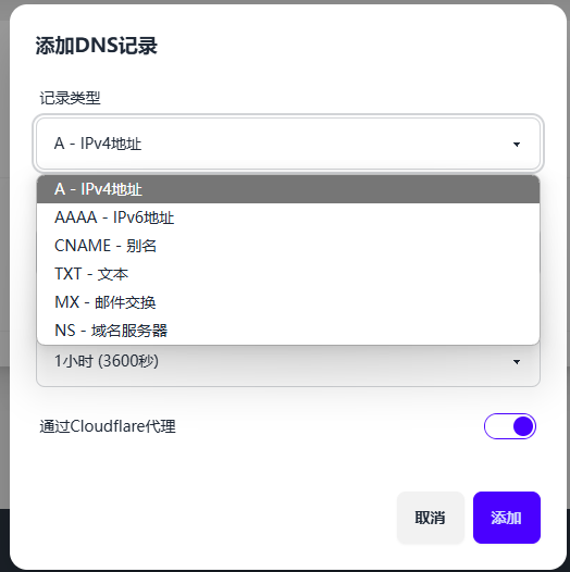 可以设置A、AAAA、CNAME、MX、TXT、NS等记录类型。