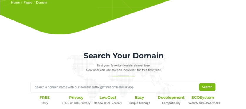 L53是一家提供免费二级域名注册服务的网站,有onflashdrive.app和ggff.net两种免费二级域名后缀可供你选择,其中注册yourname.onflashdrive.app免费二级域名可以修改DNS服务器接入Cloudflare,能享受到Cloudflare提供的CDN加速、安全保护、SSL证书、DNS解析等全套免费服务。L53免费二级域名最大的缺点是仅首年免费,续费价格为1.66美元/年。